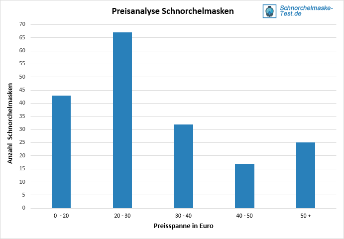 Die meisten Masken befinden sich im niedrigen Preisbereich von bis zu 30 € (110 von 184). Nur 74 der 184 Schnorchelmasken hingegen kosten mehr als 30 €.