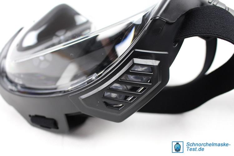 Zum anderen tritt sie über Ventile an der Seite der Maske aus. Zu diesen wird die verbrauchte Luft über separate Kanäle außen rund ums Gesicht geleitet.