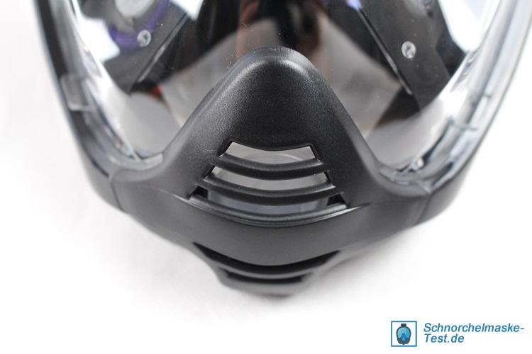 Die ausgeatmete Luft wiederum tritt einerseits über ein Ventil direkt am Kinn aus, wie im folgenden Bild zu sehen: