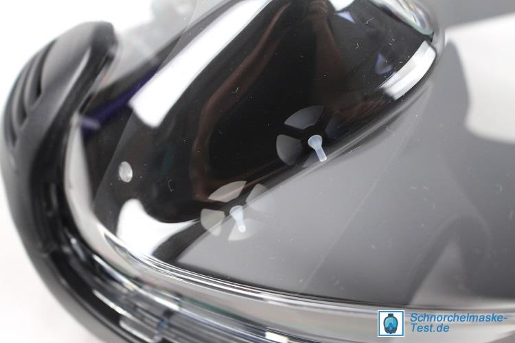 Frisch Atemluft gelangt durch den Schnorchel in die Maske und von dort aus über Ventile in den Mundraum. Diese Ventile wiederum verschließen beim Ausatmen und verhindern, dass die feuchte, ausgeatmete Luft entlang der Scheibe strömt.