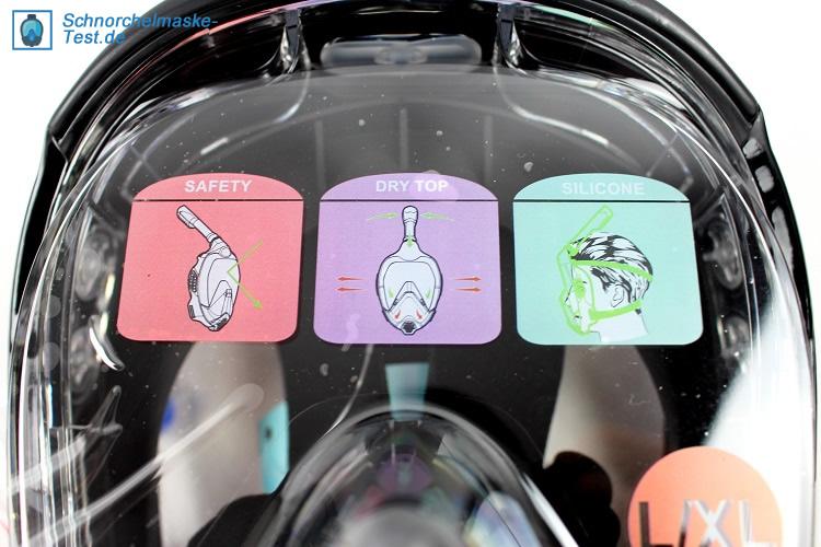 Bei der Einstellung habe ich mich an die beiliegende Bedienunganleitung gehalten. Diese beschreibt das korrekte Aufsetzen der Schnorchelmaske wie folgt: