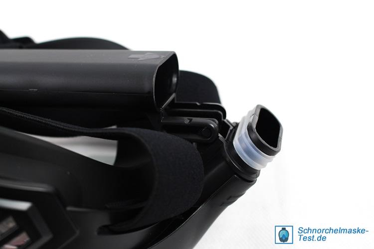 Verbunden ist der Schnorchel mit der Maske über einen Klapp-Mechanismus. Indem man diesen umlegt und den Schnorchel andrückt, erfolgt die Befestigung. Obwohl der Schnorchel nicht zusätzlich gesichert wird, hat er sich bei mir zu keiner Zeit gelöst.