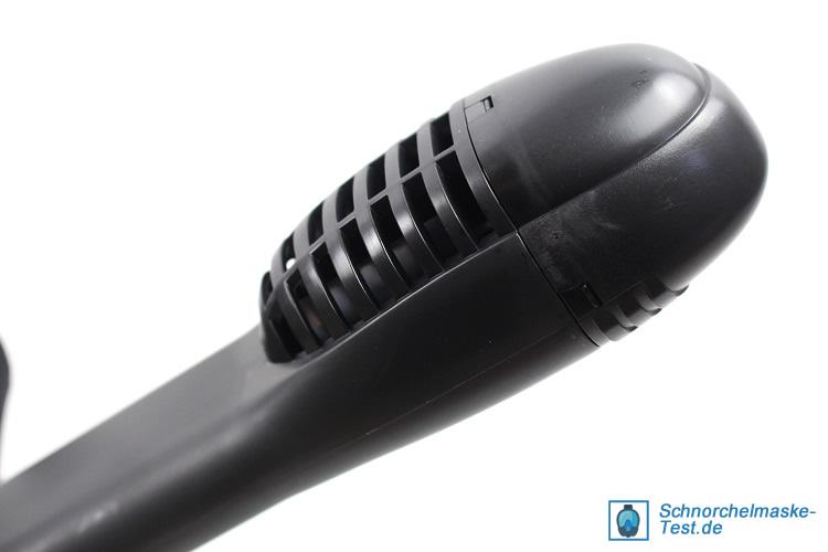 Der Schnorchel an der Khroom Seaview BC ist ein Trockenschnorchel. Im oberen Bereich befindet sich ein Schwimmkörper. Dieser steigt auf, wenn der Schnorchel unter Wasser kommt. Dadurch soll verhindert werden, dass Wasser in die Maske gelangt. In meinem Test hat das auch sehr gut funktioniert.