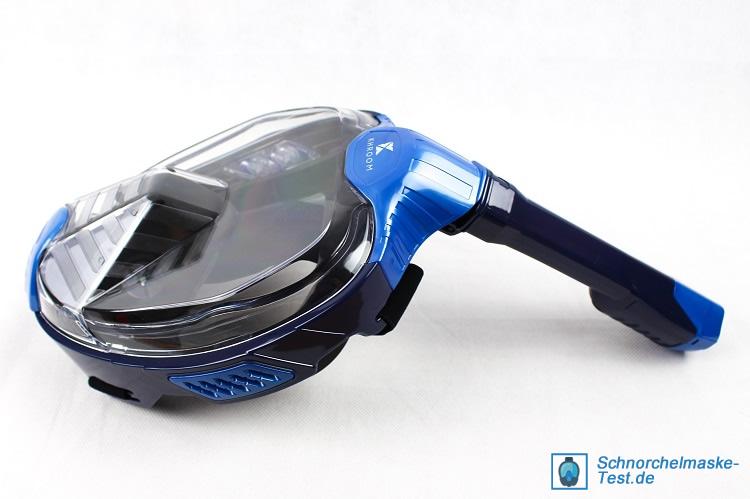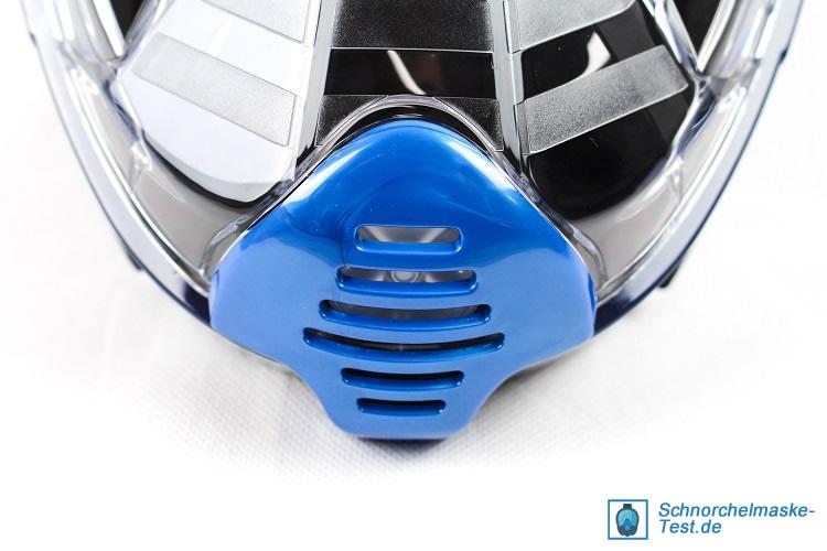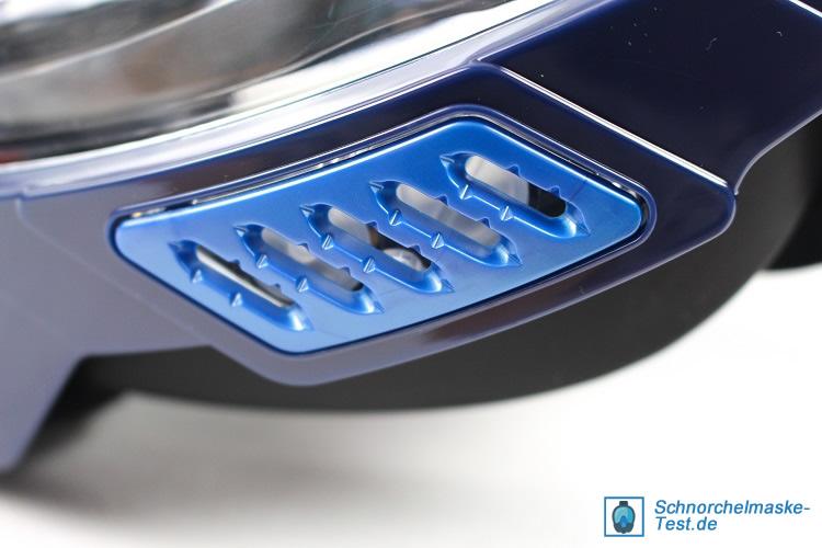 Dazu tragen auch die kurzen Wege für die ausgeatmete Luft bei. Diese muss nicht wie bei anderen Masken erst in den Schnorchel, sondern verlässt die Maske direkt über ein Ventil am Mund sowie mehrere Ventile, die sich seitlich an der Maske befinden.