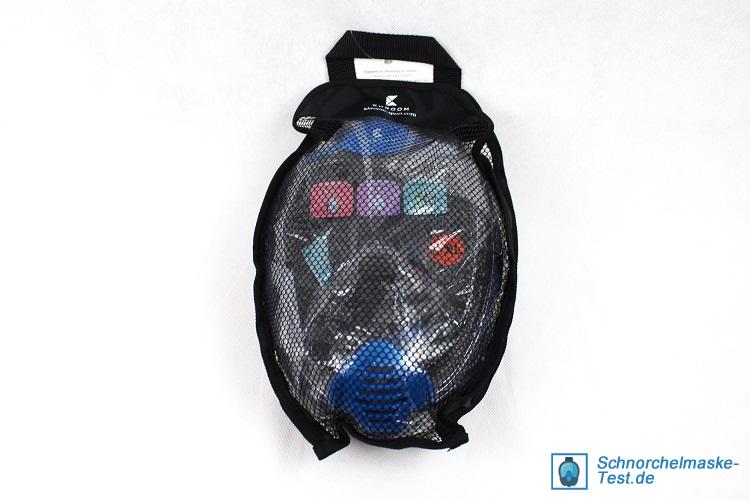 Die Khroom Seaview X wird in einem praktischen Tragebeutel geliefert. Dieser wirkt deutlich hochwertiger als bei günstigen Modellen von No-Name-Anbietern. Darin waren bei mit die Maske inklusive Schnorchel sowie verschieden Zubehörteile enthalten.