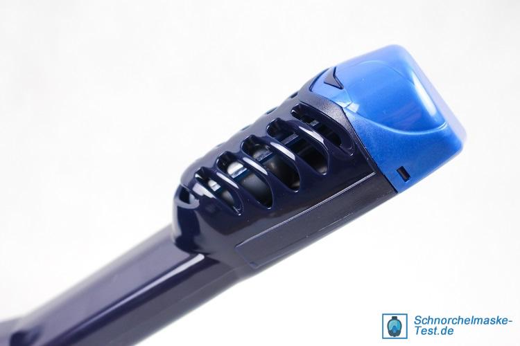 Befestigt wird der Schnorchel an der Maske, indem der über einen Scharnier umgeklappt wird. Entsprechend ist er immer mit dieser verbunden und kann nicht so leicht verloren gehen.