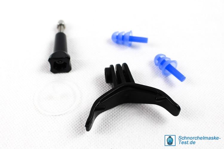 Ein Teil des mitgelieferten Zubehör ist eine Action-Cam-Halterung. Mit dieser kann eine Actionkamera an der Vollgesichtsmaske befestigt werden. Darüber hinaus sind zwei Ohrstöpsel im Lieferumfang enthalten.