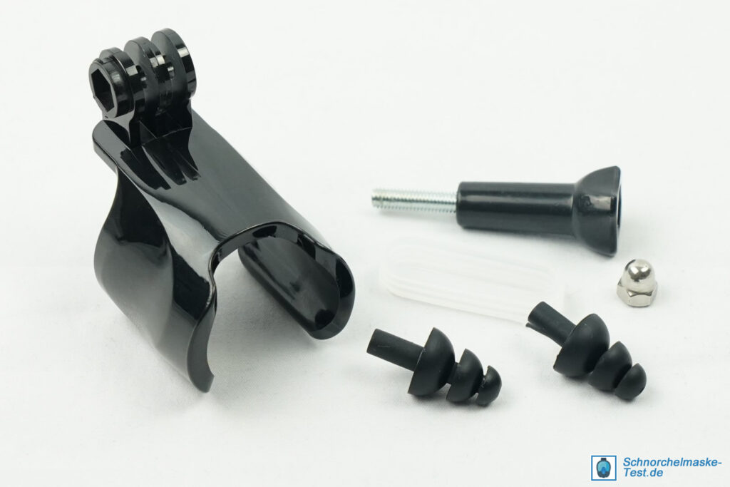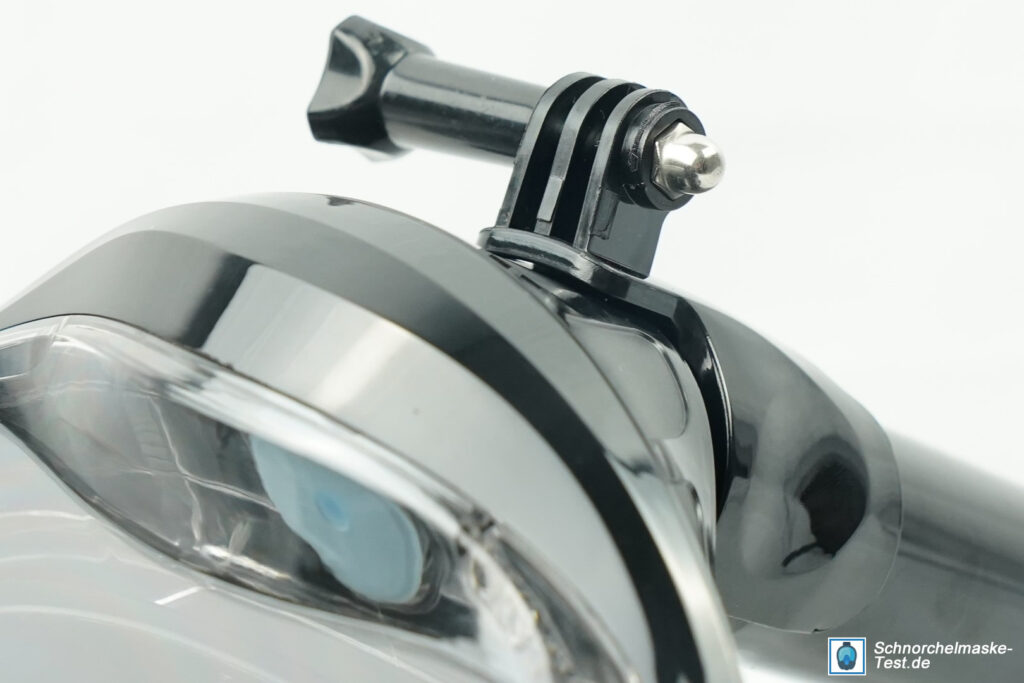 Beim Lieferumfang habe ich bereits beschrieben, dass die ActionCam-Halterung mitgeliefert wird. Diese kannst du bei Bedarf an den Schnorchel stecken und daran eine ActionCam per Schraubverschluss befestigen. So kannst du zum Beispiel mit einer GoPro dein Unterwasserabenteuer auf Video festhalten.