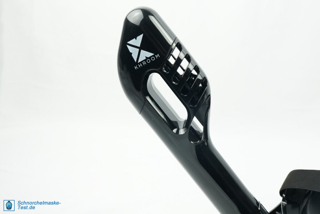 Schaut man ins Innere des Schnorchels, fällt einem eine Besonderheit beim Atemsystem der Khroom Seaview Y auf. Üblicherweise sind die Schnorchel in mehrere Kanäle für Frischluft und ausgeatmete Luft (Todluft) unterteilt. In diesem Fall besitzt der Schnorchel aber nur einen Kanal, über den die Frischluft in die Maske gelangt.
