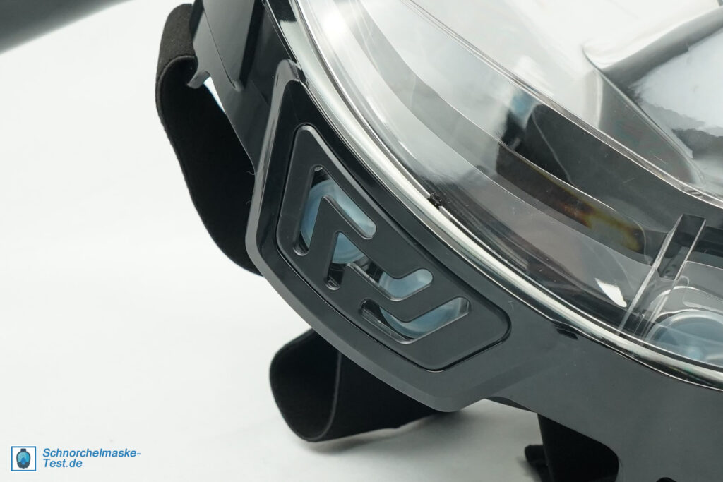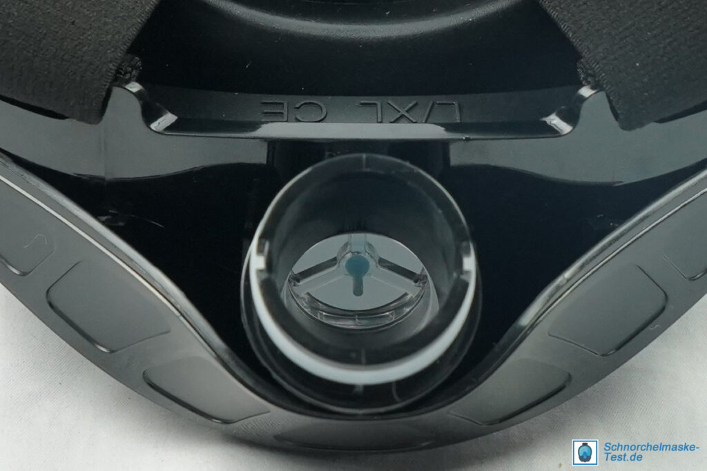 Betrachtet man die Maske näher, sieht man den Grund hierfür. Ausgeatmete Luft gelangt gar nicht erst in den Schnorchel. Stattdessen verlässt die Luft die Maske über Ventile im Mundbereich sowie an den Seiten.