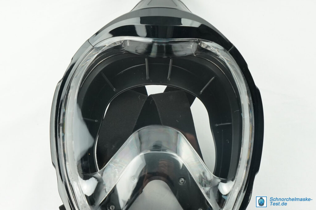 Die Schnorchelmaske besitzt ein ausgeklügeltes Atemsystem. Das verhindert, dass sich Frischluft und Todluft außerhalb des Mundbereichs vermischen. Außerdem beschlägt dadurch das Sichtfeld nicht.