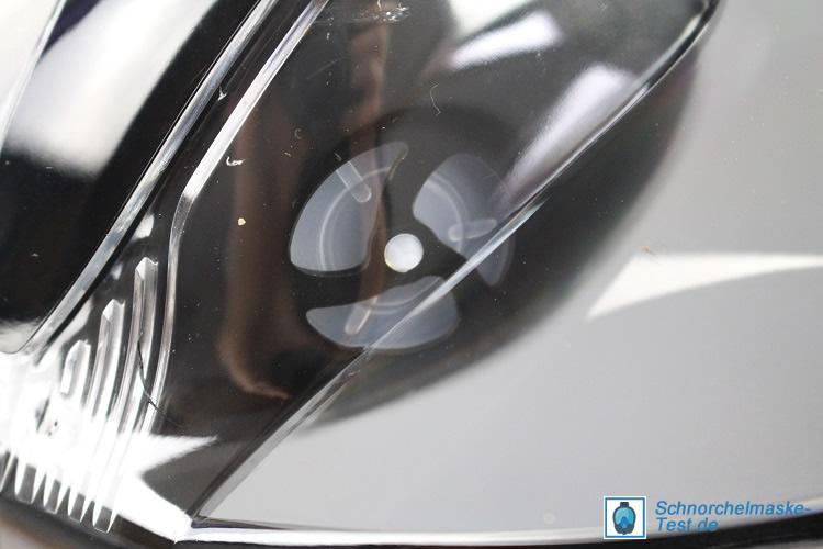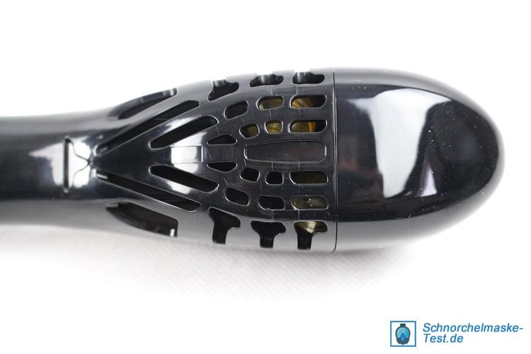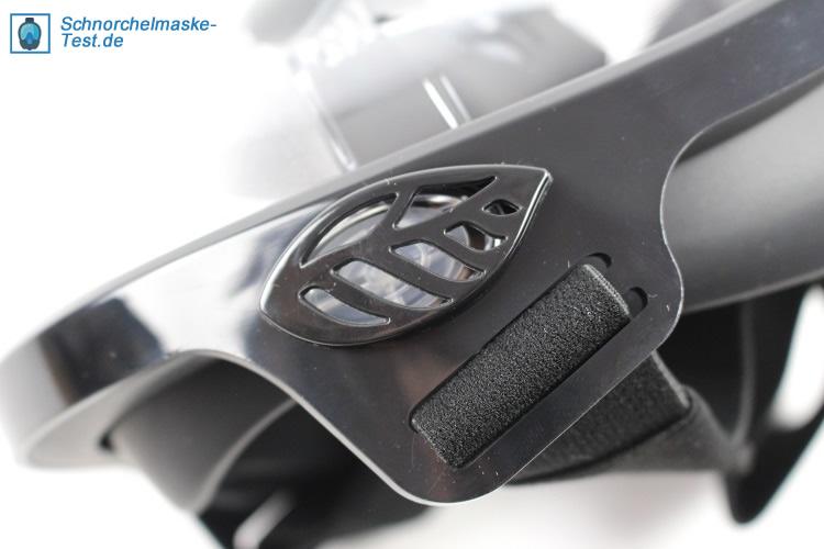 Die frische Luft von außen gelangt ausschließlich über den Schnorchel in die Maske. Von dem aus geht sie entlang der Sichtscheibe und durch Ventile in den Mundraum, wo sie eingeatmet werden kann.