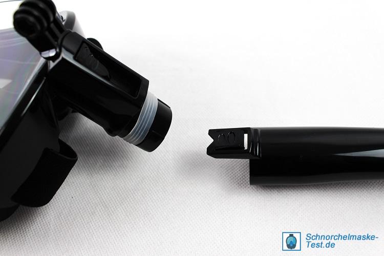 Um den Schnorchel an der Tauchmaske zu befestigen, wird dieser eingesteckt. Dafür ist an der Vollgesichtsmaske eie Öffnung vorhanden. Nachdem die Befestigung eingeklickt ist, sitzt der Schnorchel sehr fest und kann nicht aus Versehen abgelöst werden.
