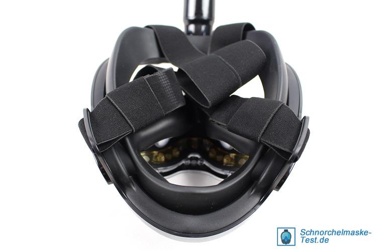 Dazu tragen auch die einstellbaren Bänder auf der Rückseite bei. Deren Länge lässt sich nach Bleiben variieren. Auf diese Weise ist eine Einstellung möglich, bei der die Maske wasserdicht und fest auf dem Gesicht sitzt, ohne dass sie zu straff aufliegt.