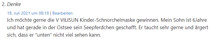Ich möchte gerne die V VILISUN Kinder-Schnorchelmaske gewinnen. Mein Sohn ist 6Jahre und hat gerade in der Ostsee sein Seepferdchen geschafft. Er taucht sehr gerne und ärgert sich, dass er „unten“ nicht viel sehen kann.
