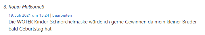 Die WOTEK Kinder-Schnorchelmaske würde ich gerne Gewinnen da mein kleiner Bruder bald Geburtstag hat.