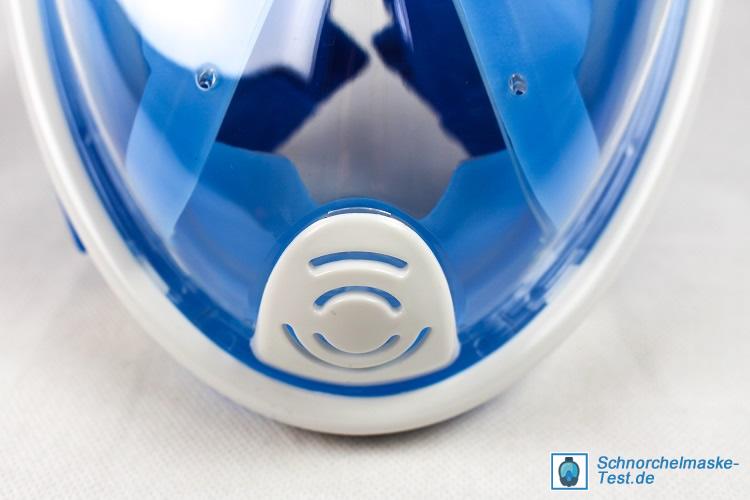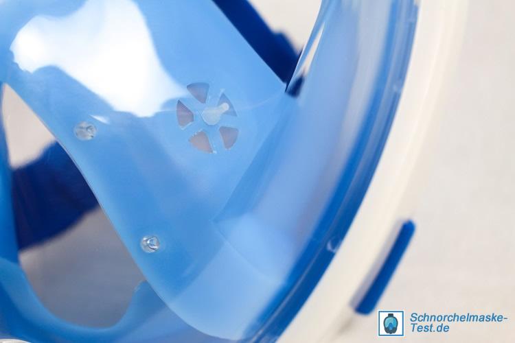 Beworben wird dieses als Zwei-Kammern-System. Das bedeutet, es gibt verschiedene Kammern für Frischluft von außen und ausgeatmete Luft. Bei der Teechaa funktioniert das nicht. Stattdessen vermischt sich Totluft mit Frischluft an der Sichtscheibe. Infolgedessen beschlägt einerseits die Scheibe. Zum anderen steigt der CO2-Gehalt in der Maske, was eine echte Gefahr unter Wasser darstellen kann (siehe hier: Wie gefährlich sind Schnorchelmasken?).